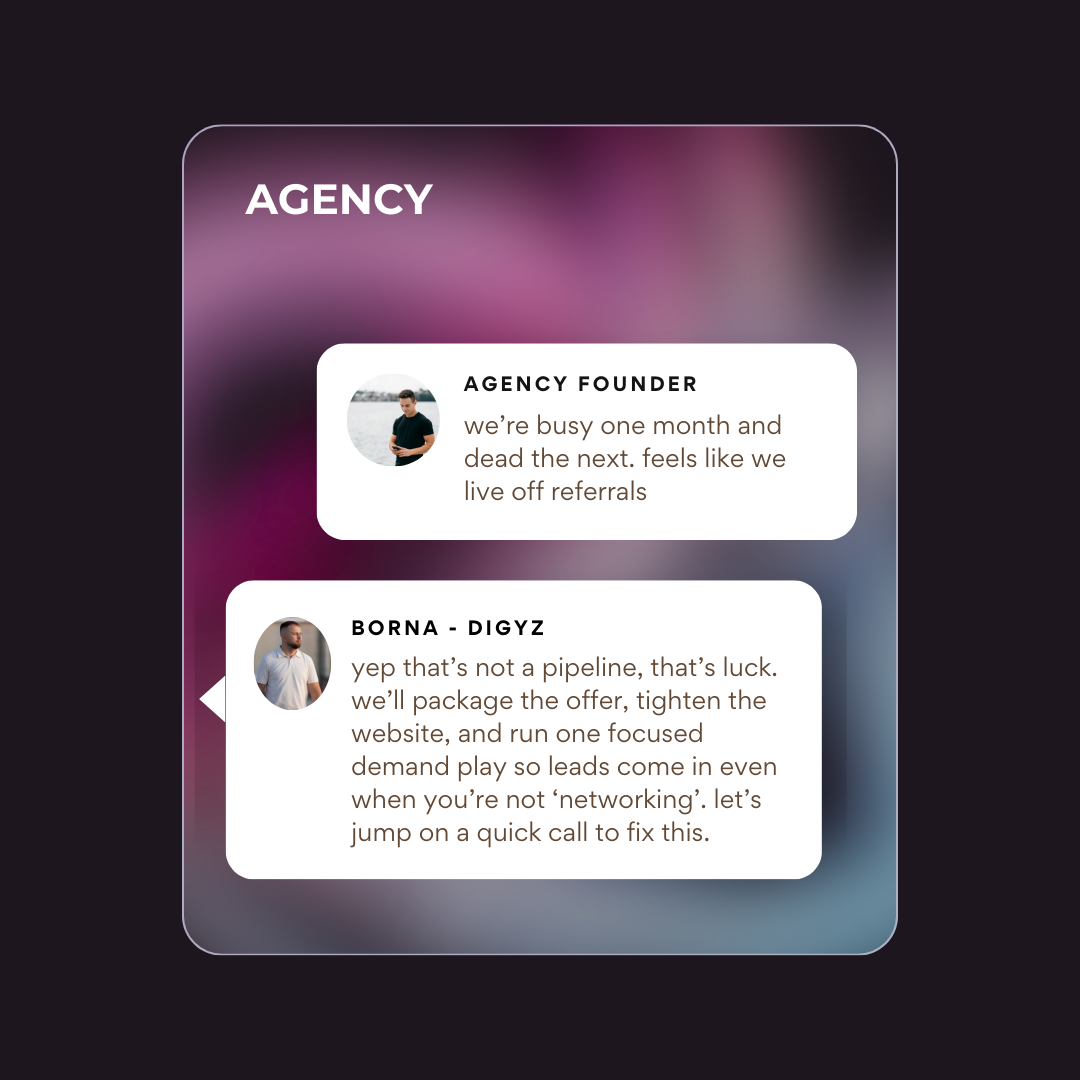 Let's talkFor B2B teams that just need one engine run properly: LinkedIn, content, website, or CRM/RevOps.
